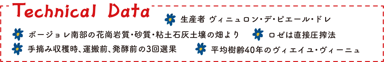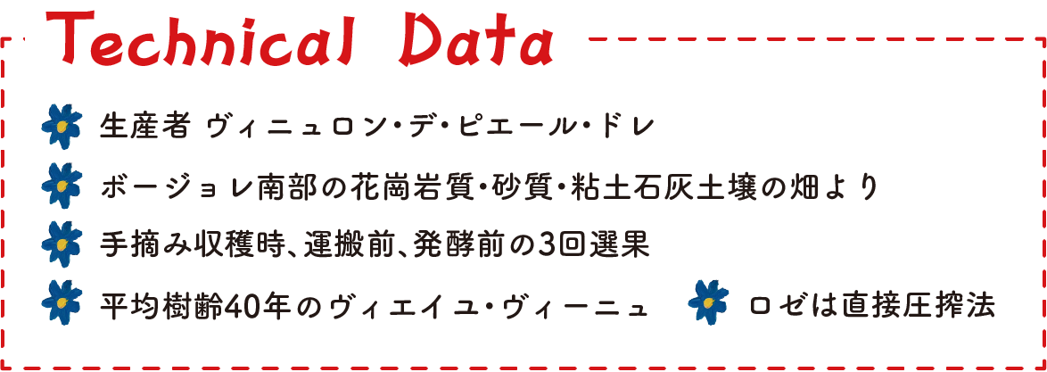 今年も心から納得がゆく素晴らしいぶどうを収穫することができました。手摘み収穫時を含め3回にわたって選果を行い、完璧なぶどうのみを選び抜き、昨年と同様に果実味・コク・酸の調和がとれた、私たちの理想とするボージョレに仕上げることができました。