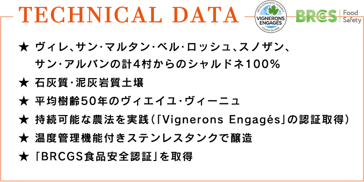 プロフェッショナル集団として知られる40人の加盟ヴィニュロンが精魂込めて育んだヴィエイユ・ヴィーニュのシャルドネを、厳格な品質管理体制のもと、最新鋭の醸造設備で醸します。